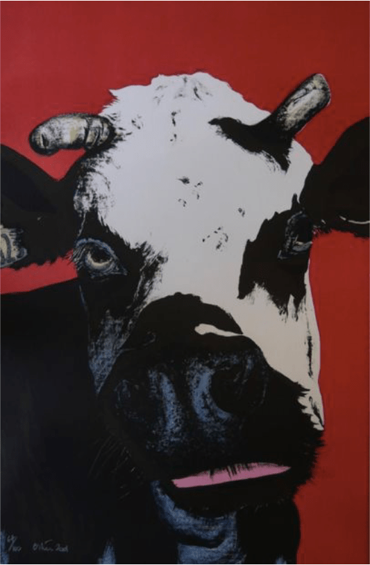 Une série qui nous interpelle particulièrement ? Celle de ses portraits animaliers qui met à l’honneur des vaches auréolées d’or, des taureaux majestueux et des chèvres qui vous regardent dans les yeux d’un air amusé. Les couleurs sont franches, les lignes sont pures, l’effet est direct.