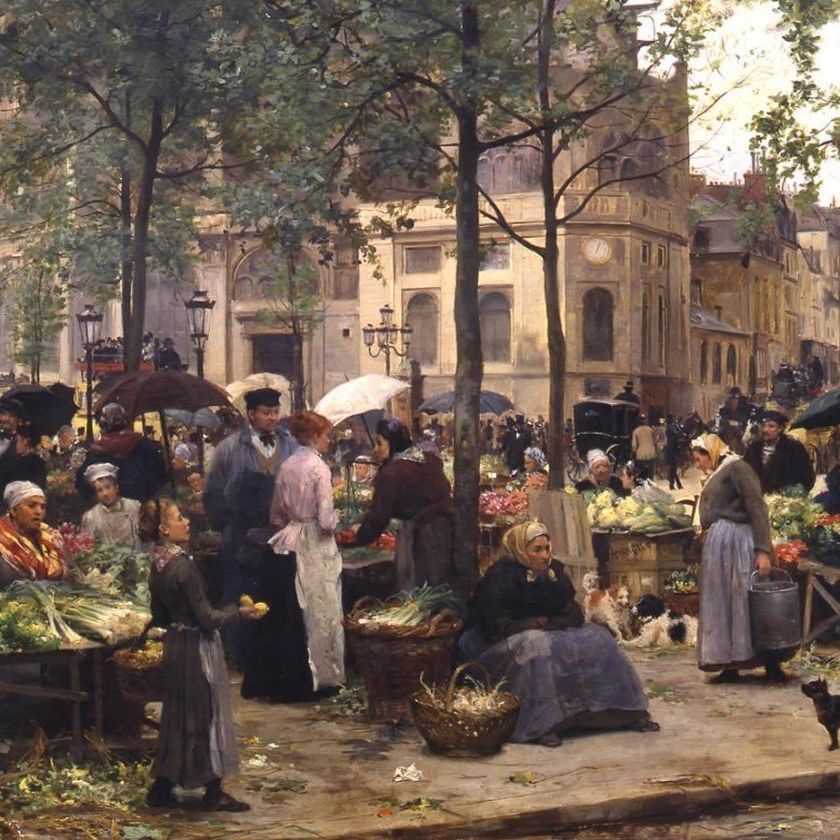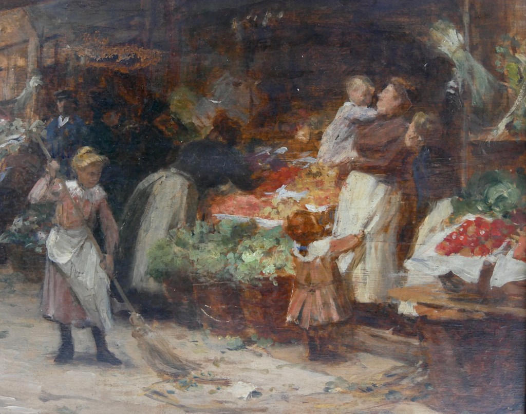 Notre esquisse représente l’un des sujets préférés de Victor Gabriel Gilbert, les marchés, lieu incontournable de la Belle Époque où de nombreux petits cabanons marchands envahissaient les trottoirs parisiens. Le peintre déclinera dans plusieurs tableaux le même étal de maraîcher comme nous le montre notre esquisse ou encore le tableau Précautions réalisé dans les années 1880.