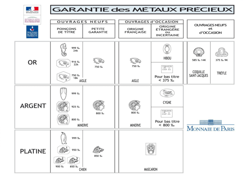- Le poinçon de titre: garantissant la qualité du métal, selon sa teneur en métal pur.
