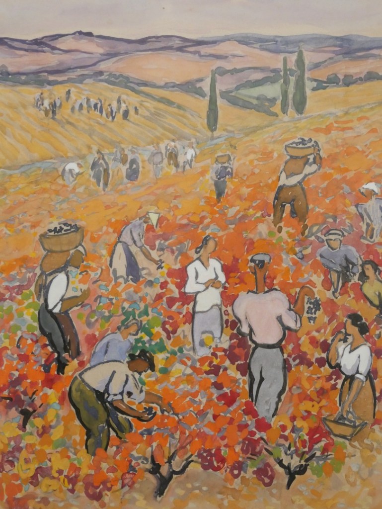 Cette sensibilité colorée est révélée dans le lot n°73 qui illustre les vendanges de Mayquerolles. Ce qui est frappant sur cette aquarelle gouachée sur papier est l’explosion polychromique que donne l’artiste à voir au spectateur avec une utilisation de couleurs chaudes passant d’un jaune chatoyant à un rouge vif. Sa peinture est marquée par l’application d’une pâte onctueuse travaillée couche par couche, ce qui donne à ses toiles un effet animé, harmonieux et une utilisation flamboyante de la lumière.