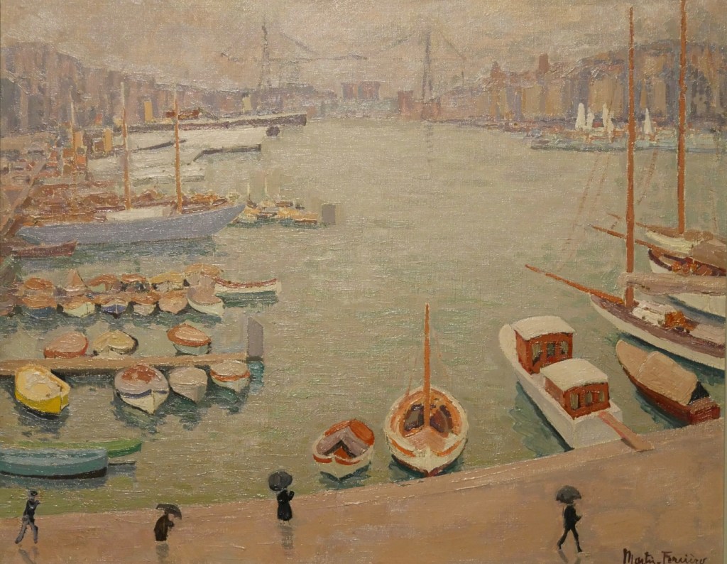 Malgré cette envie de parcourir l’Europe, l’artiste garde des liens forts avec sa France natale et notamment avec la cité phocéenne. Le lot n°71 représente le Port de Marseille, où l’eau verte émeraude, le rythme de grandes lignes des mâts de bateaux, et de nombreux détails accordés aux passants ou au traitement de chaque élément donnent une unité de couleurs et de style où transparaît une maîtrise indéniable de la composition et de la lumière chez l’artiste. Il affectionne particulièrement cette ville puisqu’il y séjourna à plusieurs reprises : dès son enfance ou encore lors de la réalisation d’une fresque pour l’Eglise Saint Louis de Marseille en 1936. Cependant il semble que le port soit le seul sujet qui ait retenu l’attention de l’artiste, sûrement puisque la lumière de la Méditerranée lui permettait de travailler sa pure sensibilité et sa délicatesse des couleurs.