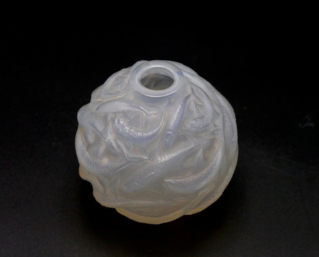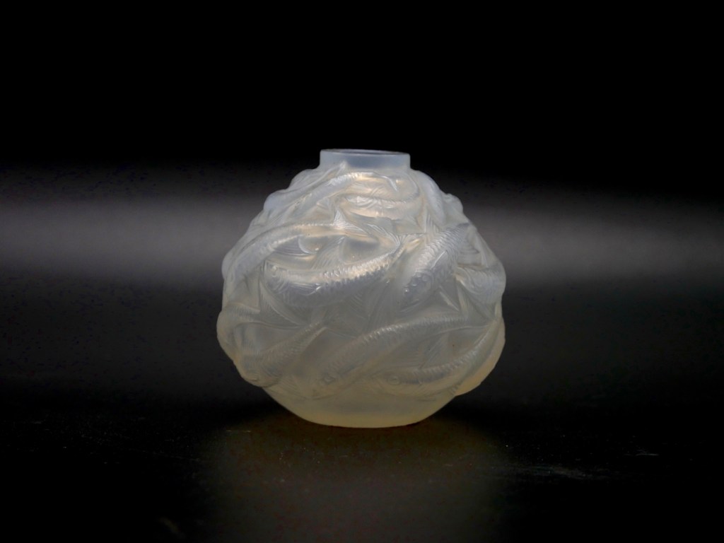 Le Vase Oléron aussi appelé Petits poissons, est un modèle créé en 1927, où le verre a été moulé et pressé. Le décor de ce flacon est d’une grande précision, et le reflet opalin donne une vive impression de mouvements des poissons, comme si ces derniers pouvaient nager et étirer le verre au gré de leur queue. Ce flacon au banc de poissons est à aller pêcher dans la vente du 10 mai 2021, et vous permettra d’observer la moindre écaille de verre imaginé par René Lalique.