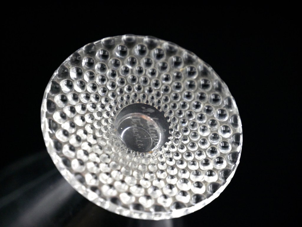 L’art verrier de Lalique est toujours à la recherche du beau et du raffinement. Le service à liqueur de modèle Nippon de notre prochaine vente du 3 mai, nous en donne un bel exemple (Lot n°92). L’épaisseur du verre est fine mais solide, et le décor sous la base du verre est remarquable : il donne la sensation que cette matière est si malléable qu’elle peut être déposée goutte par goutte comme la rosée du matin se déposant sur une rose.