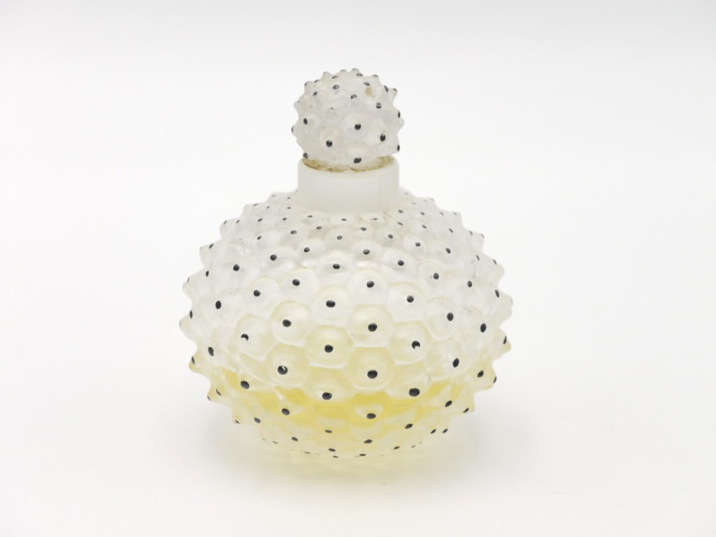 Il faut attendre l’arrivée de son fils Marc Lalique, à la tête de l’entreprise familiale pour que le verre soit changé en cristal tout en poursuivant le travail du maître. Le cristal incarne dorénavant la signature de la maison. Il est possible de retrouver ce cristal iconique dans notre prochaine vente avec le flacon de parfum cactus en cristal incolore. Son cristal est sculpté en épines de cactus, et rappelle indéniablement les thèmes chers à l’artiste René Lalique que sont la faune et la flore. Le cristal du flacon est d’un aspect blanc laiteux, il s’agit en réalité d’un satiné qui est la marque de fabrique de la maison Lalique.