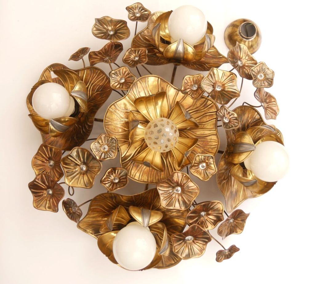 Important plafonnier à cinq lumières en cuivre et laiton représentant des nénuphars