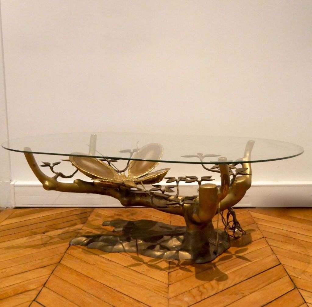 Table basse lumineuse, structure en laiton et agate formant un papillon sur des branchages