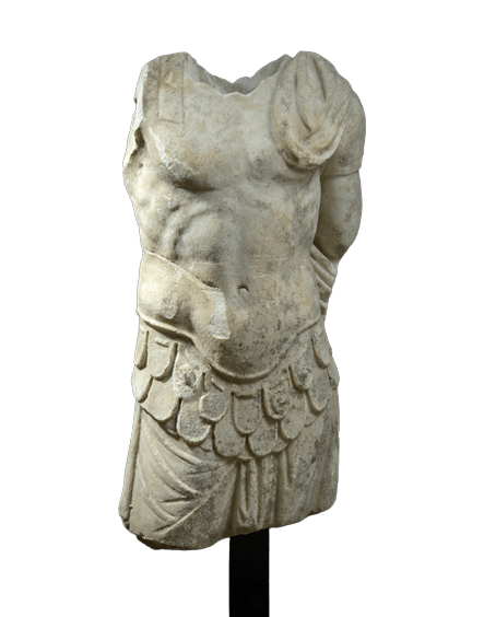 Cette sculpture représente un torse acéphale, c’est à dire sans tête, celle-ci ayant du être enchâssée. La figure est représentée debout en contrapposto. Il s’agit d’une position apparue à la fin du VIème siècle avant J.C. dans la sculpture grecque, dans laquelle le poids du corps ne vient reposer que sur l’une des jambes, la deuxième se retrouvant fléchie, et dans laquelle la ligne des épaules vient s’inverser par rapport à celle du bassin. Cette posture témoigne d’une connaissance approfondie de l’anatomie, et permet de donner à la statue une plus grande fluidité et souplesse, renvoyant une impression d’ensemble de mouvement.