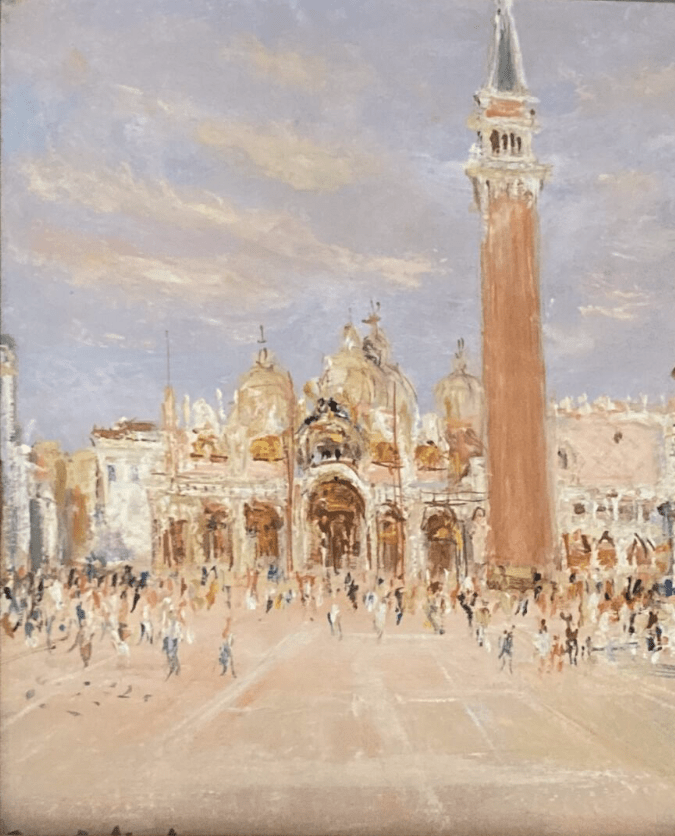 Cependant Paris ne fut pas sa seule inspiration. Belloni se rendait en effet fréquemment en Italie, et plus précisément à Venise pour trouver de l’inspiration. Les vues de cette villes sont, elles, plus chaleureuses que celles de Paris, avec des tons plus vifs et lumineux. On en retrouve deux exemple lors de notre prochaine vente : la place Saint Marc et la vue d’un pont au dessus d’un petit canal de la ville.