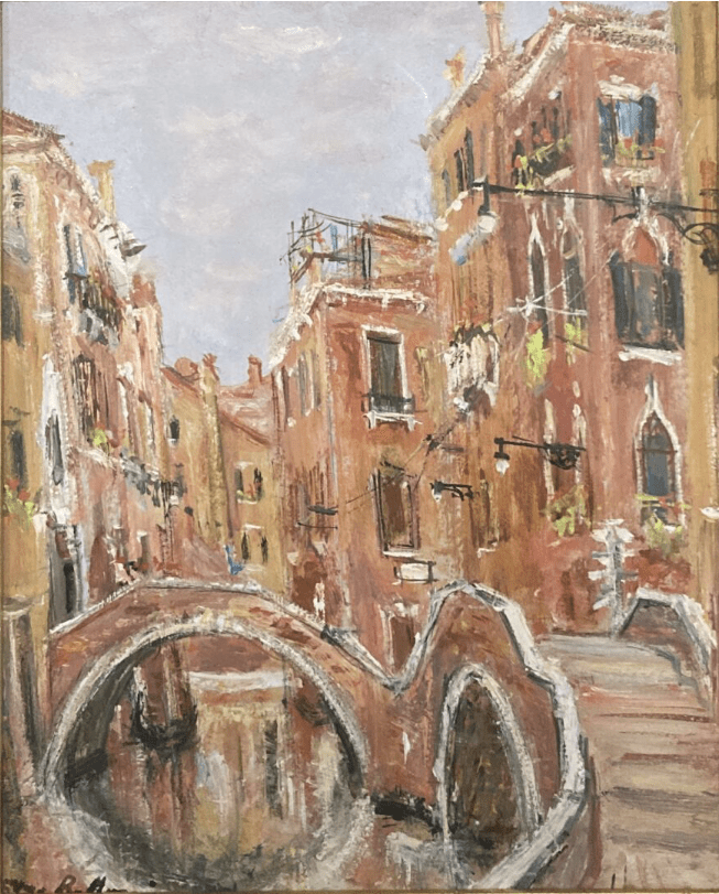 Même si les vues de Paris et de Venise composent la majeur partie de son oeuvre. On retrouve également un petit nombre de tableaux abordant d’autres sujets dont des représentations de fleurs. Le pont japonais de Giverny présenté dans la vente du 17 janvier 2023 en est un bel exemple de ce genre.