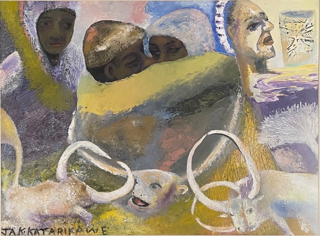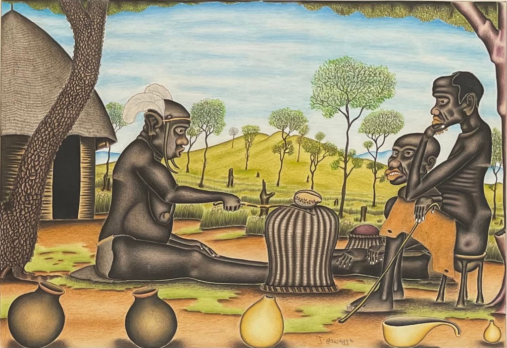 Joël Oswaggo (né en 1944) est un artiste kenyan qui représente des scènes du quotidien avec une grande finesse et richesse dans les détails par l’utilisation des crayons de couleurs. Cet artiste fut l’un des pionnier de l’art kenyan diffusé grâce à des galeries telles que la Galerie Watatu où Monsieur T. fut client. Joël Oswaggo dénote par ses scènes quotidiennes contemplatives.
