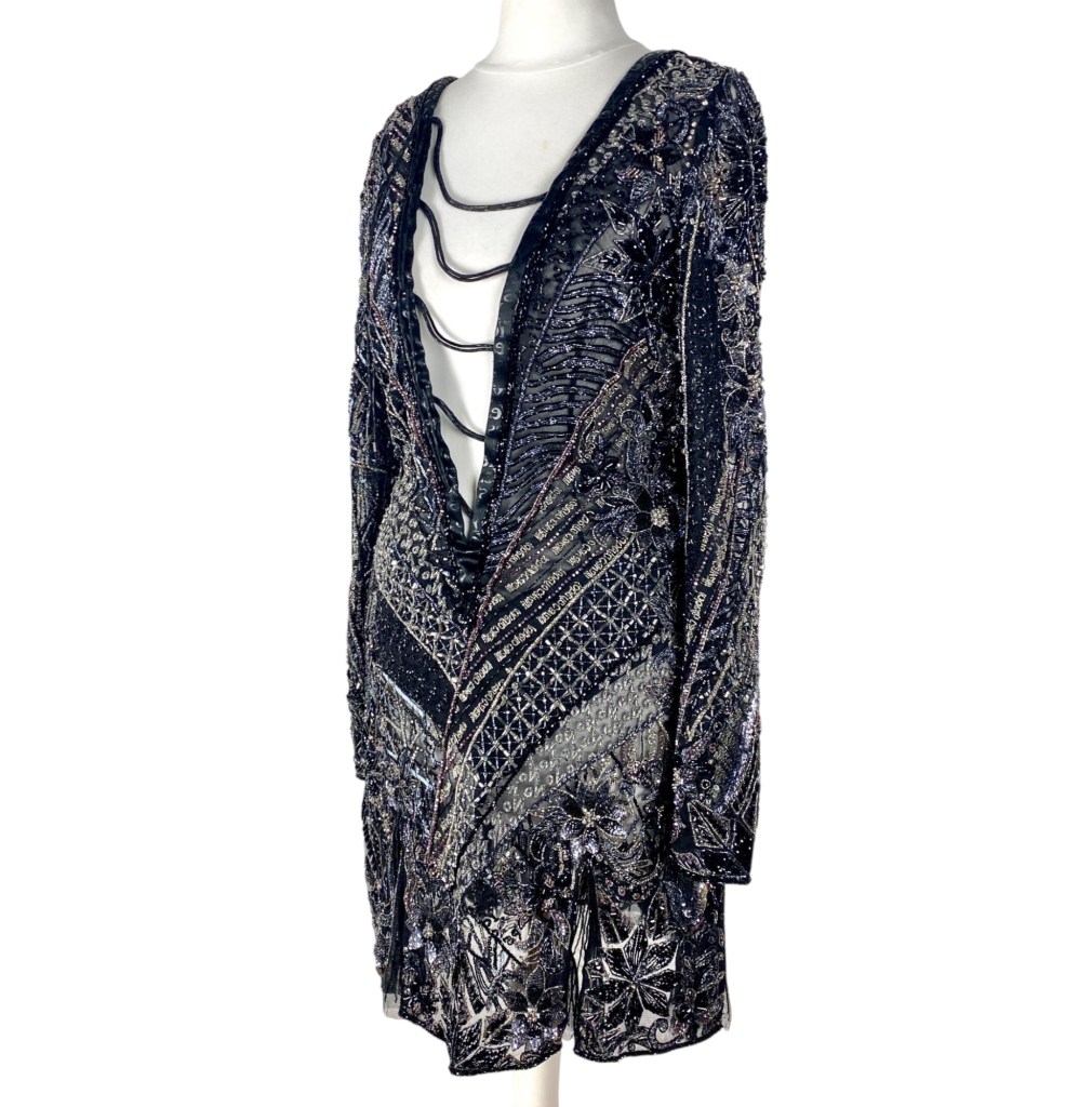 Mini robe drapée en polyamide, nylon et soie brodée de perles et sequins de métal argenté.