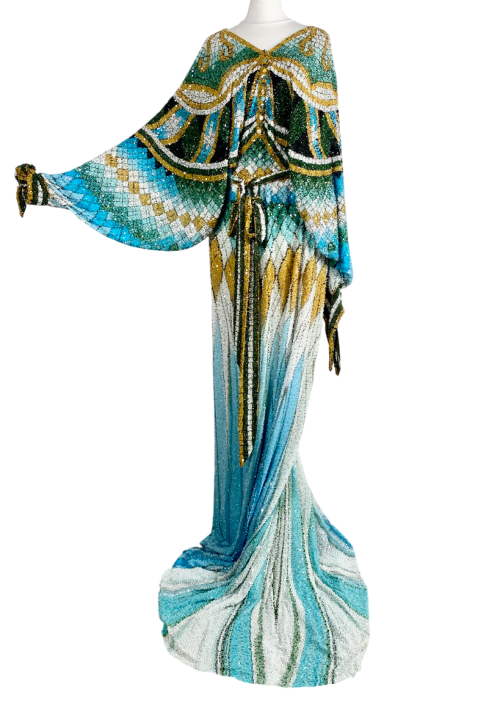 Robe longue de soirée en soie brodée de perles et sequins brillants sur fond bleu ciel.