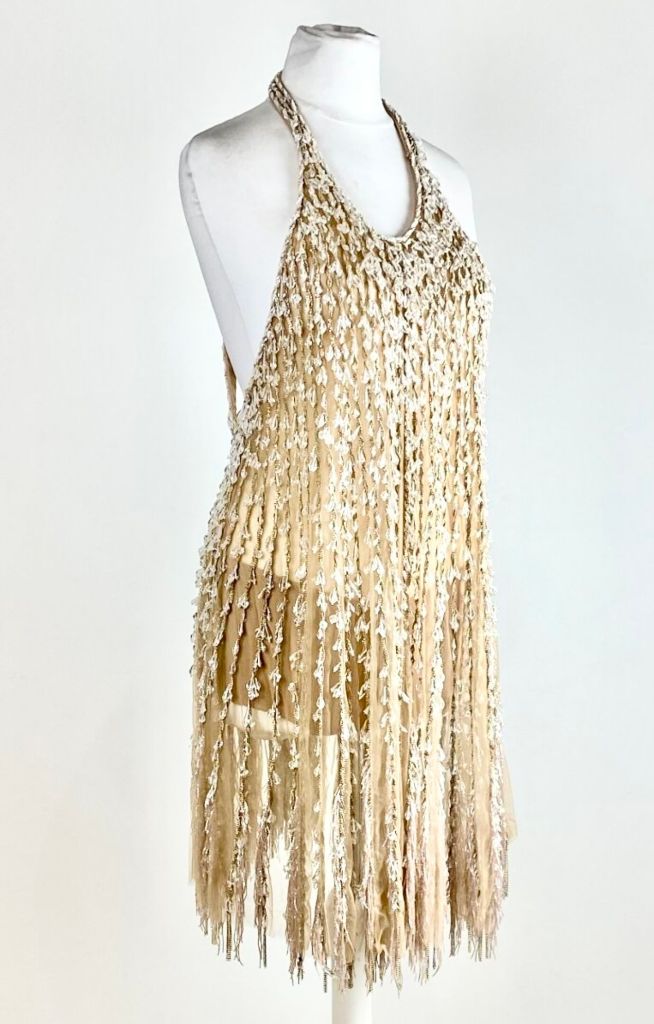 Mini-robe en résille polyamide et soie beige, chaines métalliques ornées de rangs de perles transparentes formant gouttes.