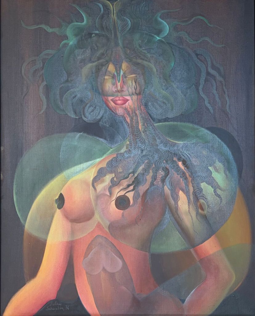 Son travail séduit aujourd’hui par sa liberté formelle et par la cohérence d’un univers développé en dehors des courants dominants. Entre visions intérieures, figures en métamorphose et paysages imaginaires, Juliana Seraphim propose une œuvre singulière, à la fois intime et universelle, définissant un territoire où le rêve devient langage.