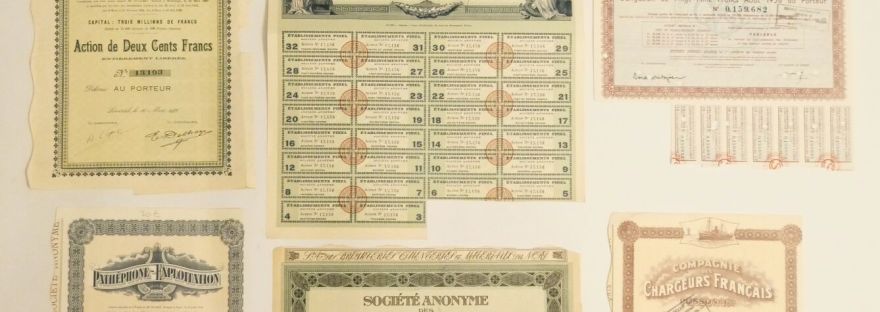 La scripophilie se définit par la collection des titres financiers anciens tels que les bons et actions au porteur. Depuis les années 1980, cette passion s’inscrit de manière plus large dans la numismatique. Les titres financiers anciens sont mis à l'honneur dans notre prochaine vente online qui se terminera le mardi 15 février 2022. Lot… Lire la suite La scripophilie : une passion pour les titres financiers anciens